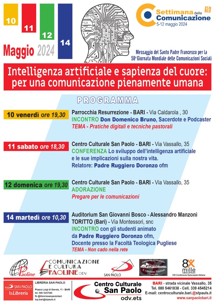 A Bari, dal 10 al 14 maggio, la parrocchia Resurrezione, il Centro Culturale San Paolo e padre RuggIero Doronzo, organizzeranno vari incontrI, per commentare il tema della Giornata Mondiale delle Comunicazioni Sociali 2024.