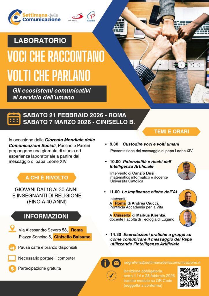 Interessante e partecipativo è stato il Laboratorio organizzato da Paoline e Paolini, che si è svolto a Roma il 21 febbraio, presso la Società San Paolo (Via A. Severo 58), su: “Voci che raccontano, Volti che parlano. Gli ecosistemi comunicativi al servizio dell’umano”.