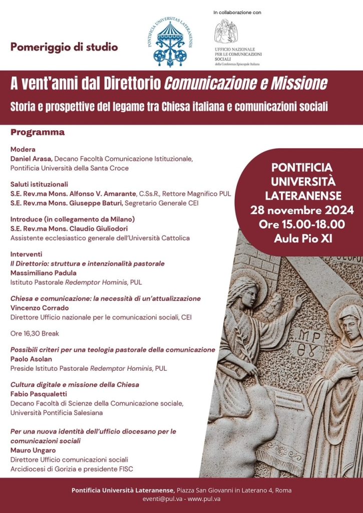 Celebreremo questo anniversario il prossimo 28 novembre presso la Pontificia Università Lateranense durante un pomeriggio di studio organizzato dall’Istituto pastorale Redemptor hominis in collaborazione con l’Ufficio nazionale per le comunicazioni sociali della CEI – Conferenza Episcopale Italiana. Con l’obiettivo di riflettere sul documento, ma anche di attualizzarlo alla luce dei profondi cambiamenti comunicativi degli ultimi due decenni.